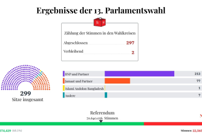 Die Bangladesh Nationalist Party (BNP) nach den 13. nationalen Parlamentswahlen als klar stärkste Kraft hervorgegangen. Millionen Menschen nutzten in einer oft festlichen und friedlichen Atmosphäre ihr lange verwehrtes Wahlrecht. Nach den finalen Ergebnissen der Wahlkommission sowie den eigenen Auszählungen der Partei sicherten sich die BNP und ihre Verbündeten 212 der 299 Sitze, während das Bündnis um die Bangladesh Jamaat‑e‑Islami 77 Sitze gewann. Die BNP, die seit fast zwei Jahrzehnten nicht mehr regiert hat, bezeichnet das Ergebnis als „überwältigendes Mandat der Bevölkerung“. Auch die Bangladesh Jamaat‑e‑Islami, ehemals enger Partner der BNP, verzeichnete deutliche Zugewinne. Der BNP‑Vorsitzende Tarique Rahman wird nach 17 Jahren im Exil in Großbritannien neuer Premierminister Bangladeschs.