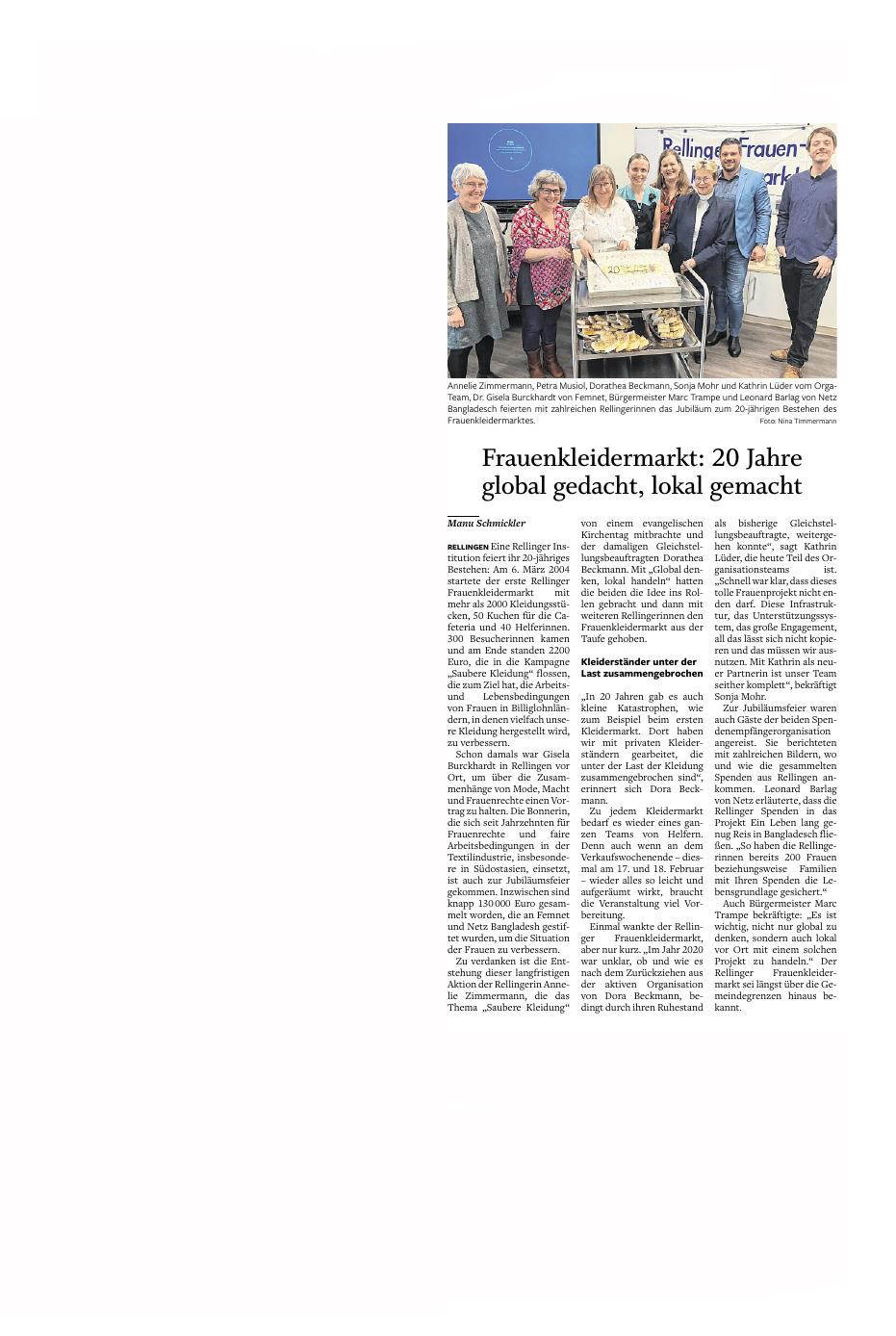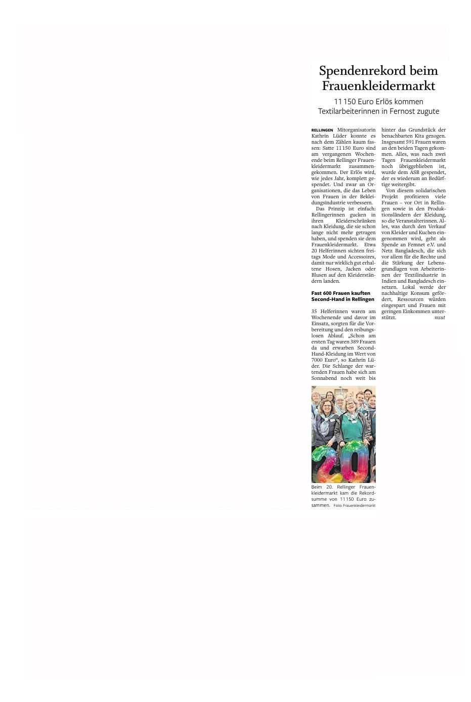 Die Veranstaltung war nicht nur ein Ort des Stöberns und Entdeckens von Second Hand Klamotten, sondern auch ein Markt der Solidarität und des Engagements für und von Frauen. Durch die Einnahmen des Kleiderverkaufs mit zahlreichen Besucherinnen konnte dieses Jahr – pünktlich zum 20-Jahres-Jubiläum – ein neuer Spendenrekord aufgestellt werden. Mit dem Erlös werden Projekte für Frauen in der Textilindustrie der Organisation Femnet sowie das Projekt „Ein Leben lang genug Reis“ von NETZ unterstützt, in dem sich Familien in Bangladesch ein selbstbestimmtes und würdevolles Leben aufbauen.