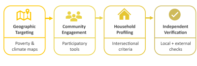 Pre-selected lists are cross-checked with local authorities, NGOs, and MFIs. Where possible, verification is supported by independent actors to ensure accountability.