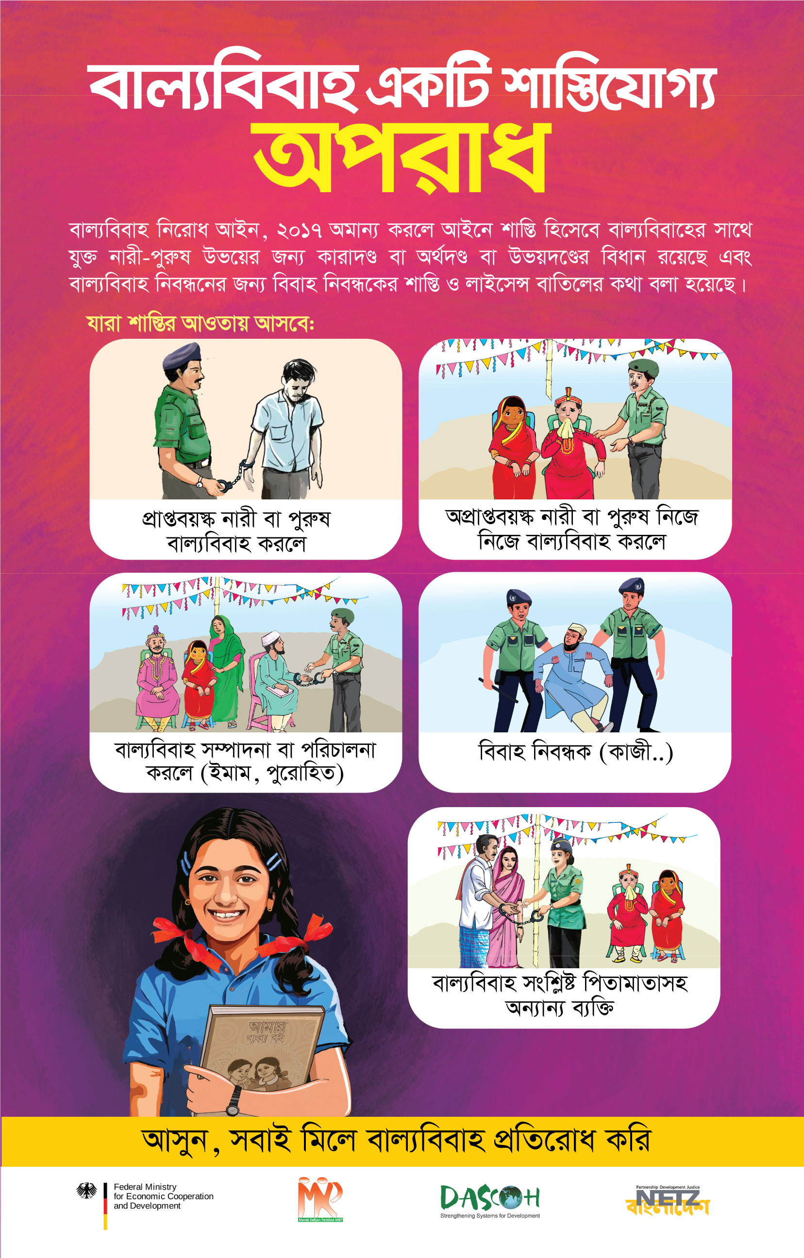 Still, child marriage is a common practice in Bangladesh. But it is illegal. This poster clarifies the legal issues and helps stop this punishable offence.