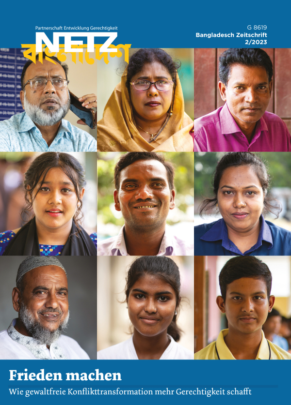 Friedensmacher*innen im Nordwesten Bangladeschs bringen Fälle von Menschenrechtsverletzungen an die Öffentlichkeit, unterstützen Opfer und sorgen vor allem dafür, dass es gar nicht erst zu Gewalt kommt. Sie bilden eine große zivilgesellschaftliche Initiative, in der sich nicht nur Freiwillige und Helfer*innen, sondern vor allem auch Betroffene selbst gegen Unrecht und Diskriminierung einsetzen. Die NETZ-Ausgabe beleuchtet, wie die Friedensinitiative arbeitet und bietet exklusive Stimmen der Engagierten.