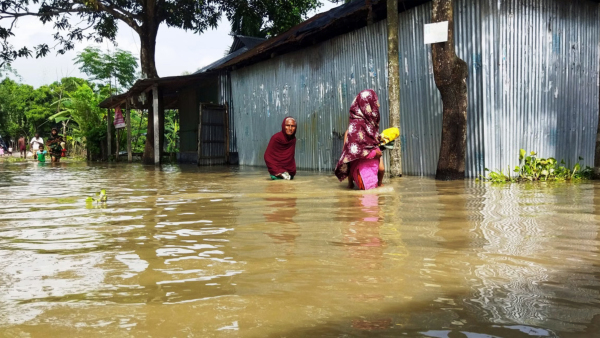 Mehrere Flüsse haben im Norden Bangladeschs weite Landstriche überflutet. Mehr als 100.000 Menschen waren betroffen und mussten ihre Häuser verlassen. Auch 150 Familen im NETZ-Projekt "Klimagerechte Zukunft" waren betroffen. Sie erhielten Reis von ihren Dorfgruppen, um die Situation zu überstehen.