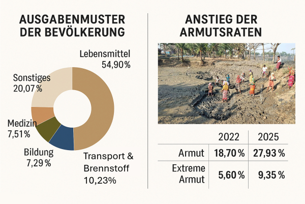 Die Armut in Bangladesch nimmt deutlich zu. Eine aktuelle Studie zeigt, dass mehr als ein Viertel der Bevölkerung unterhalb der Armutsgrenze lebt - fast jede*r Zehnte in extremer Armut. Viele Haushalte geben über die Hälfte ihres Budgets für Lebensmittel aus und verschulden sich wegen steigender Preise oder Ausgaben für die Gesundheitsversorgung.